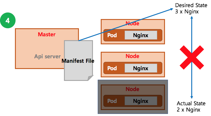 - Cluster의 Actual State가 Declared State와 다르면 Kubernetes는 Manifest File을 사용하여 이를 수정한다.