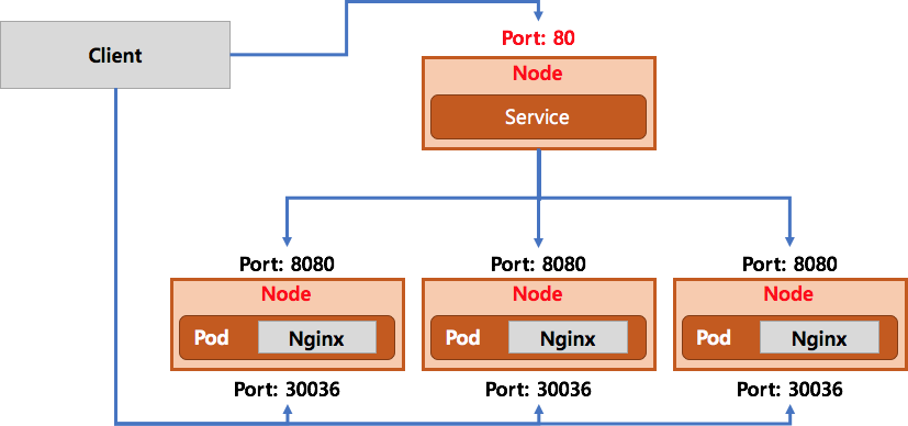 위 이미지를 보면, Service에 열려있는 포트 80으로 들어가면, TargetPort인 8080을 통해 Load Balancing이 되는 것을 볼 수 있지만, nodePort인 30036을 통해 바로 연결도 가능한 것을 알 수 있다.