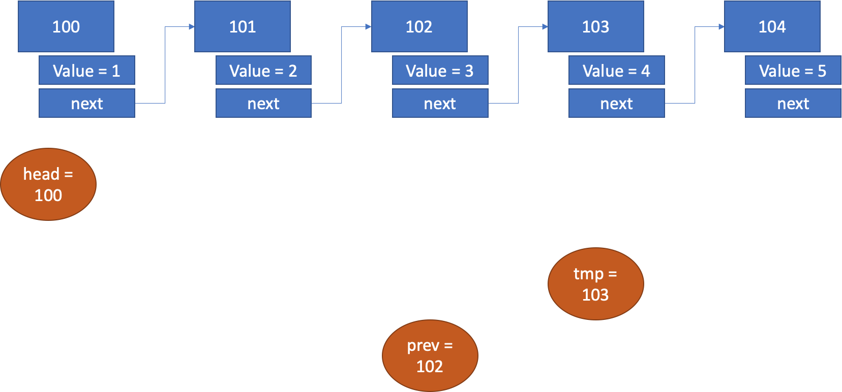 위와 같은 주소값(100~104)들을 가지는 Node가 5개 있다고 가정하자.