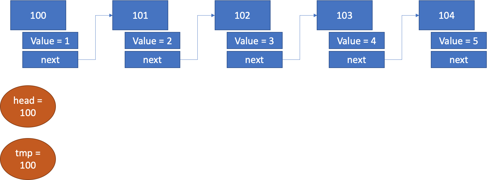 그렇지만, Tmp = Tmp.next로 변화시키는 것은 Head에 영향을 주지 않는다. (tmp가 100에서 101을 보게 되는 것 뿐이며, Head는 여전히 100을 바라본다)
