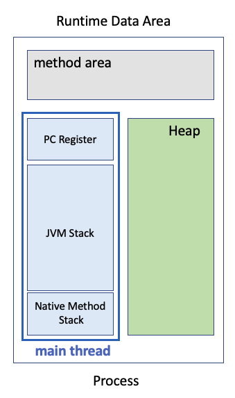 JVM에서는 프로그램을 수행하기 위해 OS로부터 메모리 공간들을 할당 받는다. (즉 하나의 프로세스다)